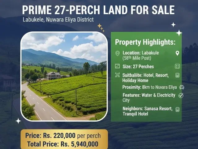 විශිෂ්ට ආයෝජන අවස්ථාවක්! ලබුකැලේ, 58 වන කණුව අසල ගම්පොළ-නුවරඑළිය ප්‍රධාන මාර්ගයට මායිම්ව පිහිටි මෙම පර්චස් 27 ක වටිනා ඉඩම් කොටස දැන් විකිණීමට. නුවරඑළිය නගරයට කි.මී. 8 ක් පමණක් දුරින් පිහිටා ඇති මෙම ඉඩම, හෝටල් සංකීර්ණයක් හෝ නිවාඩු නිකේතනයක් සඳහා අතිශයින්ම සුදුසුයි.
